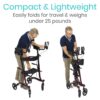 Constructed with a lightweight aluminum frame, the Vive upright walker is exceptionally durable, safely supporting up to 300 pounds. Easy to transport, the tall rollator walker folds for compact storage,fitting in the trunk of a car or even in the backseat.
